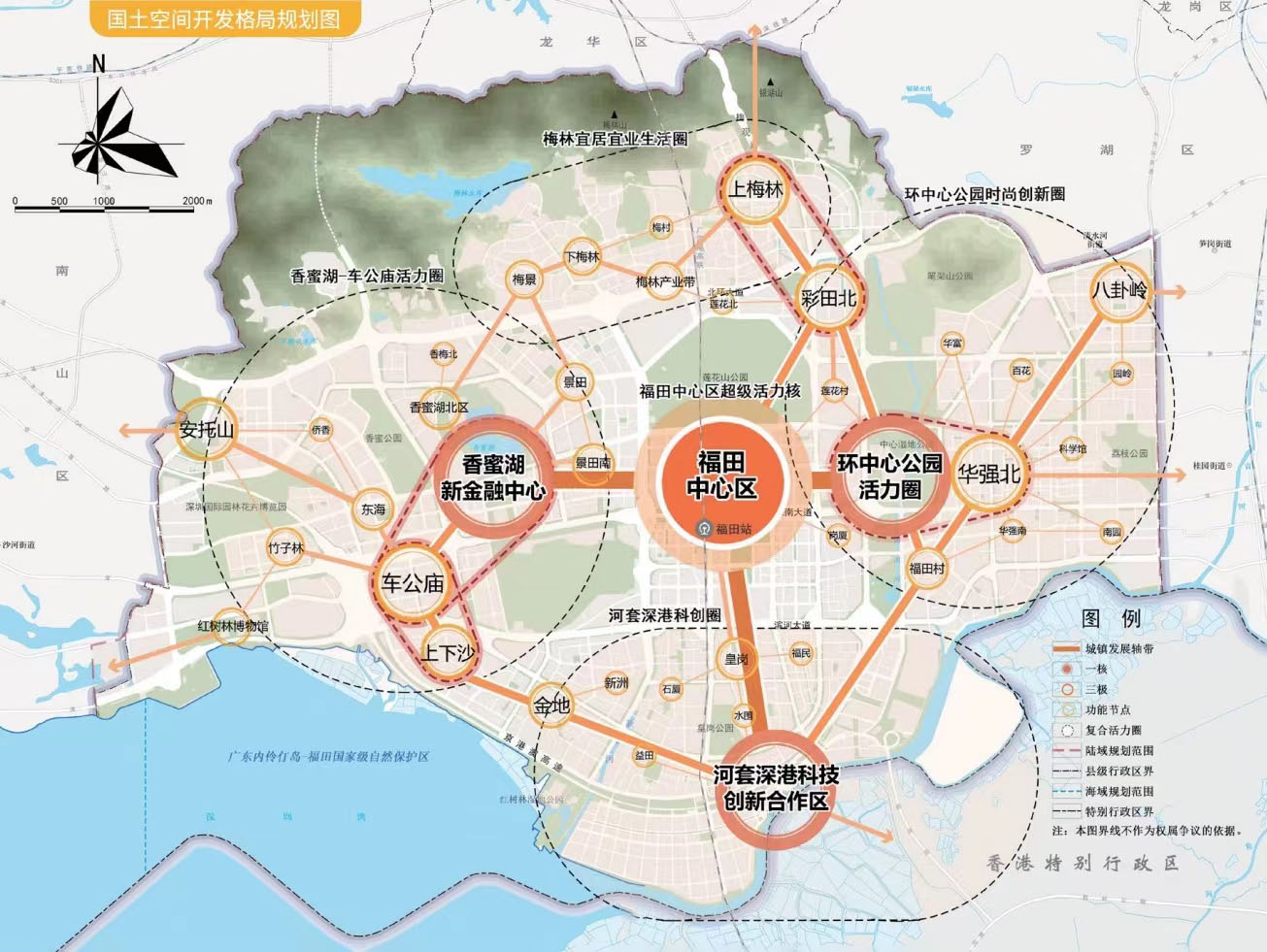 ● 福田將打造“一核三極融圈”的城市開(kāi)發(fā)格局。一核福田中心區(qū);三極 “三大新引擎”發(fā)展極核:河套深港科技創(chuàng)新合作區(qū)、香蜜湖新金融中心、環(huán)中心公園活力圈;融圈 四個(gè)“業(yè)創(chuàng)居游”復(fù)合活力圈:河套深港科創(chuàng)圈、香蜜湖—車(chē)公廟活力圈、環(huán)中心公園時(shí)尚創(chuàng)新圈、梅林宜居宜業(yè)生活圈