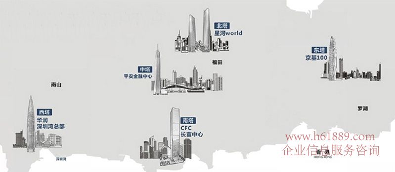這五座地標(biāo)寫字樓如下:東塔京基100、南塔CFC長富中心、西塔華潤集團(tuán)總部大廈、北塔星河WORD雙子塔、中塔平安國際金融中心