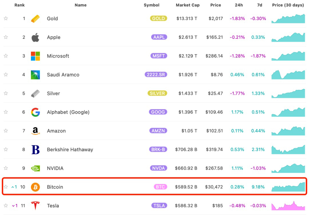 值得注意的是,隨著比特幣價格持續(xù)強勢上漲,其市值已升至5895.2億美元,成功超越特斯拉,重返全球市值前10大資產(chǎn)/公司,而特斯拉當(dāng)前市值則為5863.2億美元,下滑至第11位