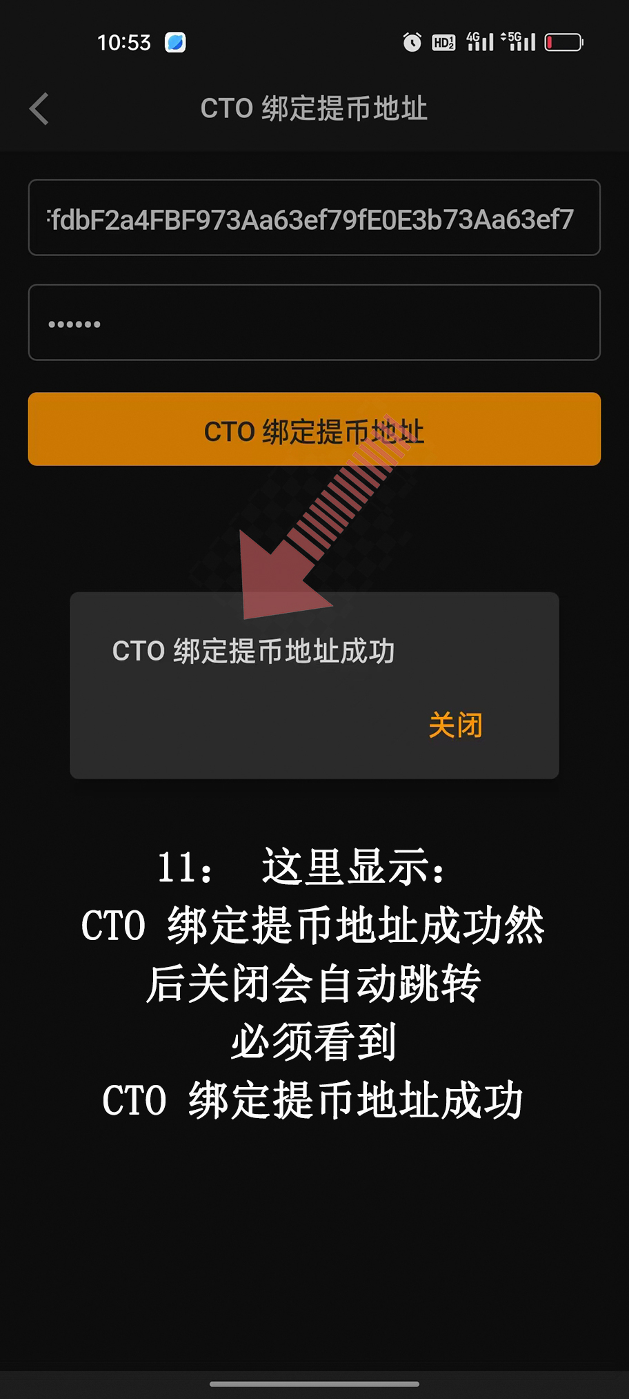 11:這里顯示:CTO 綁定提幣地址成功:然后關(guān)閉會自動跳轉(zhuǎn)