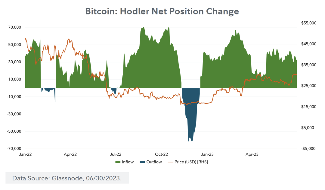 比特幣長期持有者對最近的訴訟事件不受影響,從“Hodler Net Position Change”數(shù)據(jù)中可以看出,他們持續(xù)在約30,000美元水平附近累積