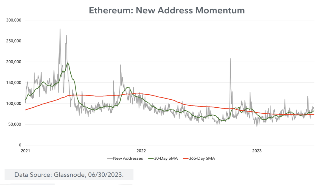 以太坊今年迄今價格上漲約62%,其價格信號和鏈上指標呈現(xiàn)出潛在的積極跡象。以太坊網(wǎng)絡繼續(xù)維持銷毀速度高于發(fā)行速度,導致網(wǎng)絡中的以太坊數(shù)量減少了超過700,000個?!?/span>New Address Momentum”指標再度回升,預示著網(wǎng)絡活動和使用的擴展。盡管許多分析師預期Shapella(上海升級)升級后質(zhì)押的以太坊會減少,但我們持相反觀點,預計質(zhì)押的以太坊會增加,因為驗證者的流動性風險降低,資本效率提高。本季度驗證者數(shù)量總體上增長了15%