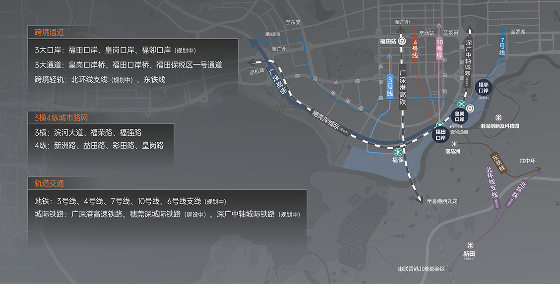 深港直聯(lián)直通 暢達(dá)灣區(qū)接軌國(guó)際跨境交通:3大口岸+3大通道3橫4縱城市路網(wǎng)軌道交通:5條地鐵+3條城際鐵路