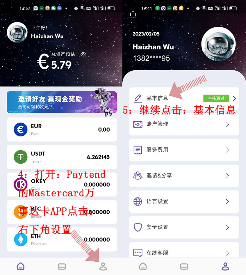 4:打開:Paytend的Mastercard萬(wàn)事達(dá)卡APP、點(diǎn)擊:右下角設(shè)置、5:繼續(xù)點(diǎn)擊:基本信息