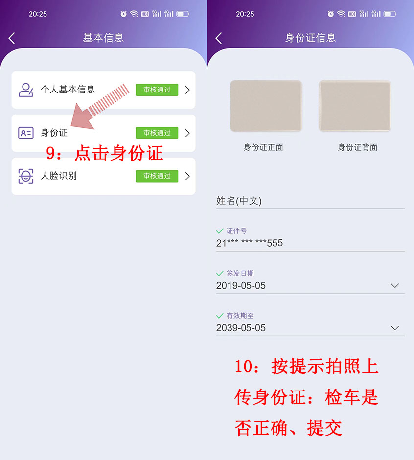 9:點(diǎn)擊身份證、10:按提示拍照上傳身份證:檢車是否正確、提交