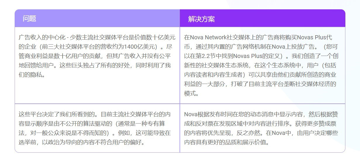 代幣的用處 - 對(duì)于Nova從廣告收入中的每一美元,其中一部分將用于回購(gòu)代幣。因此,用戶(包括內(nèi)容讀者和內(nèi)容生成者)將真正擁有并從他們的內(nèi)容中獲利,共享他們積極參與所帶來(lái)的商業(yè)利益。