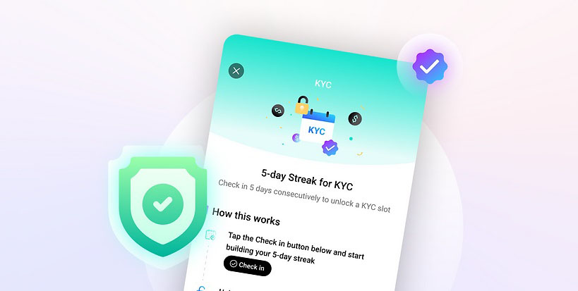 應(yīng)用程式上線之后,用戶就可以在里面進(jìn)行 KYC。當(dāng)用戶連續(xù)簽到一定天數(shù)后,他們將獲得一個(gè) KYC 名額,以提交個(gè)人文件進(jìn)行驗(yàn)證。