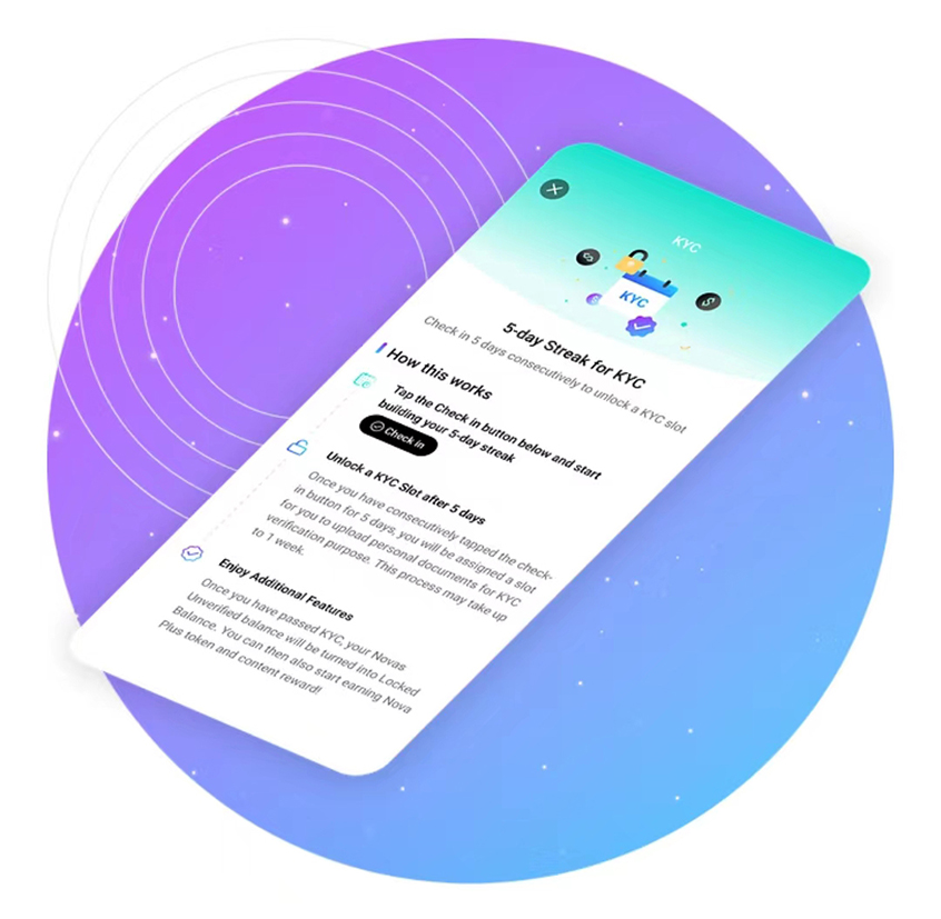 用戶在連續(xù)登錄 Nova Network 一定數(shù)量的天數(shù)后有資格進行KYC。一旦您通過了 KYC,您可以開始同時獲得 Novas Plus 代幣和 Novas 代幣的獎勵。