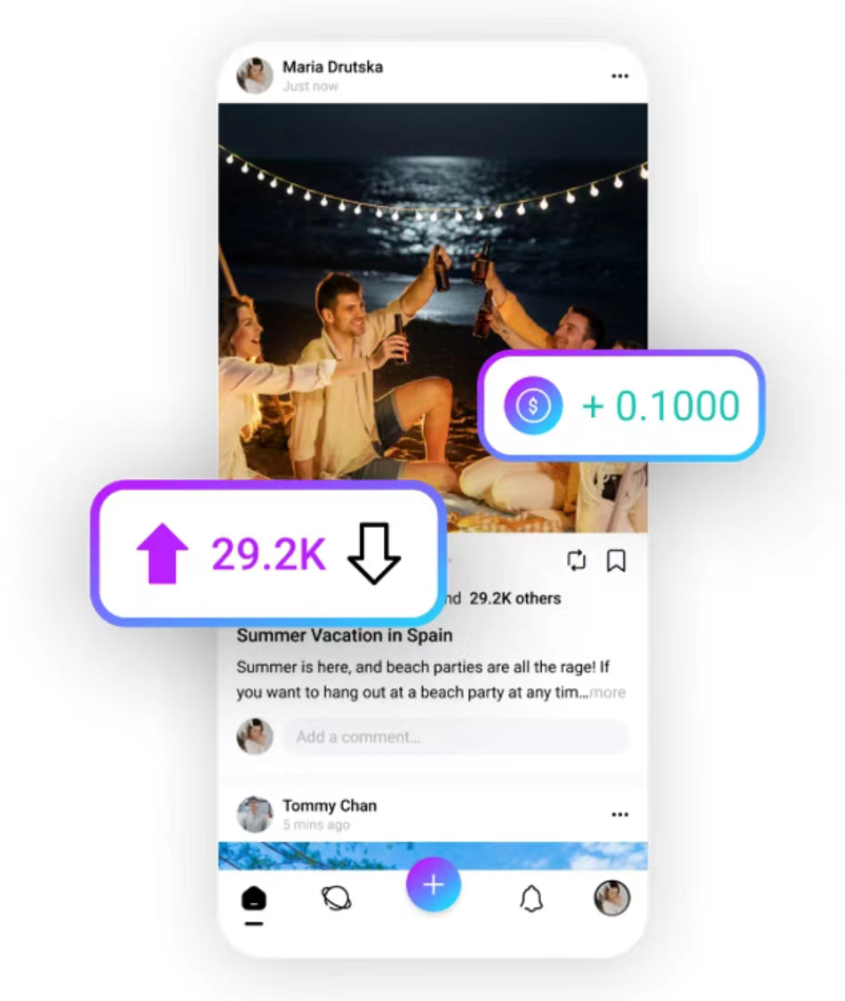 我們讓用戶對(duì)內(nèi)容進(jìn)行支持或否定投票,投票結(jié)果會(huì)影響內(nèi)容在應(yīng)用發(fā)現(xiàn)墻中的顯示優(yōu)先級(jí)以及內(nèi)容創(chuàng)建者的代幣分配。用戶還可以對(duì)帖子發(fā)表評(píng)論、與其他用戶互動(dòng)并發(fā)起對(duì)帖子的討論