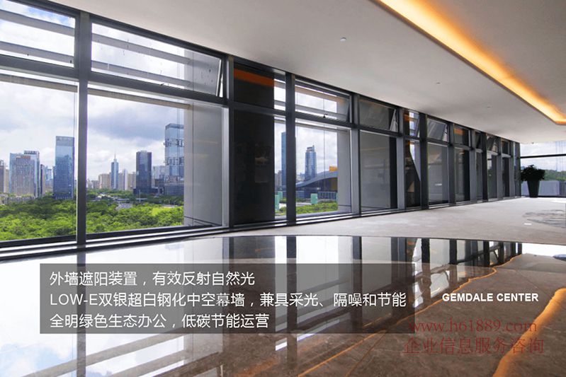 外墻遮陽裝置、有效反射自然光、LOW-E雙銀超白鋼化中空粉幕墻、兼具采光、隔噪和節(jié)能、全明綠色生態(tài)辦公、低碳節(jié)能運營