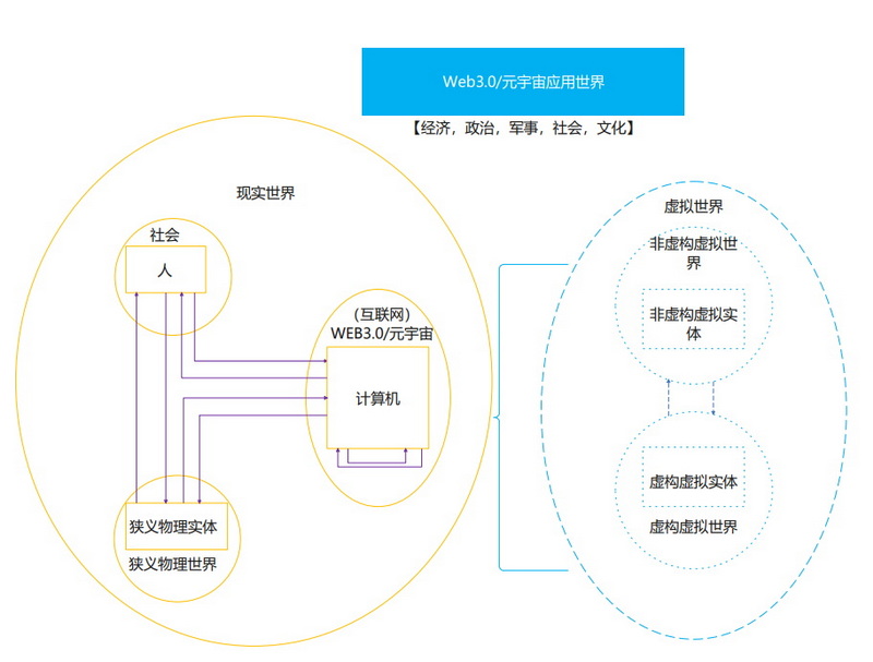 在結(jié)構(gòu)上:Web3.0 / 元宇宙 應(yīng)用世界是虛擬世界和現(xiàn)實(shí)世界等2個世界融合為一體