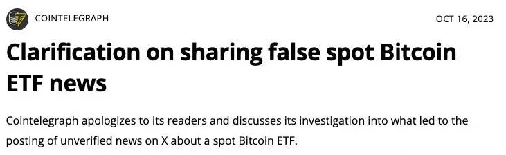 2023年10月16日:Cointelegraph 發(fā)布虛假新聞“美國(guó)SEC批準(zhǔn)貝萊德的iShare比特幣現(xiàn)貨ETF”以及多家ETF在DTCC備案獲得股票代碼的消息、引發(fā)比特幣行情從27000美元跳漲至35000美元