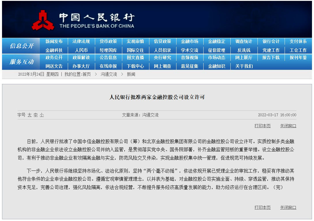 2022317日,中國(guó)人民銀行宣布,已于日前批準(zhǔn)了中國(guó)中信金融控股有限公司(籌)和北京金融控股集團(tuán)有限公司的金融控股公司設(shè)立許可。這標(biāo)志著我國(guó)設(shè)立金融控股公司邁出實(shí)質(zhì)性一步,金融控股公司正式迎來持牌經(jīng)營(yíng)新階段。未來一段時(shí)間,將有更多的金融控股公司設(shè)立申請(qǐng)被受理和批準(zhǔn)。應(yīng)進(jìn)一步細(xì)化相關(guān)制度辦法,提升金融控股公司監(jiān)管效能,規(guī)范金融秩序、防范金融風(fēng)險(xiǎn),推動(dòng)金融控股公司更好地服務(wù)實(shí)體經(jīng)濟(jì)。